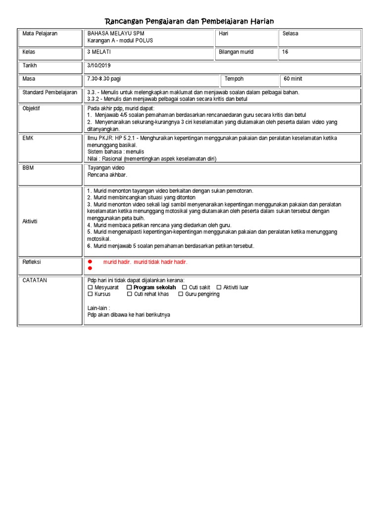 Bahasa Melayu Bahasa Kita. Rancangan pengajaran harian merupakan satu rekod khas yang disediakan oleh guru sebelum menjalankan sesi pengajaran dan pembelajaran di sekolah. Hubungi telegram di bawah untuk.
